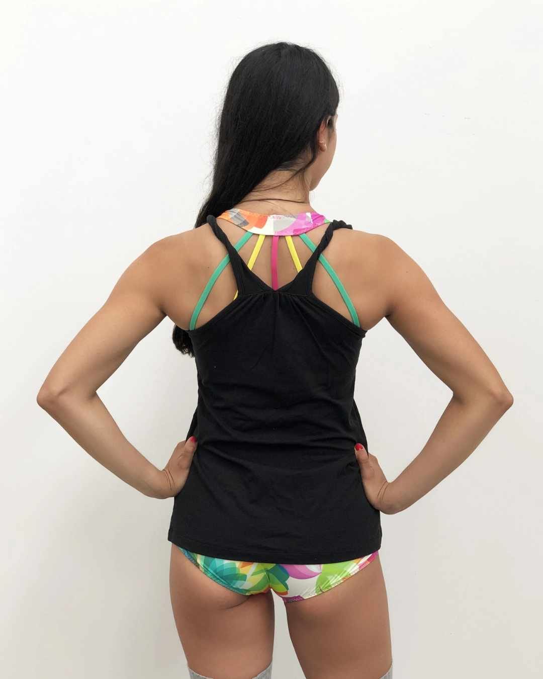 La Canotta Nera PPole Dance è morbida, lunga e leggera, con un intreccio di spalline sul retro che valorizza la schiena e lascia intravedere il top sotto.
