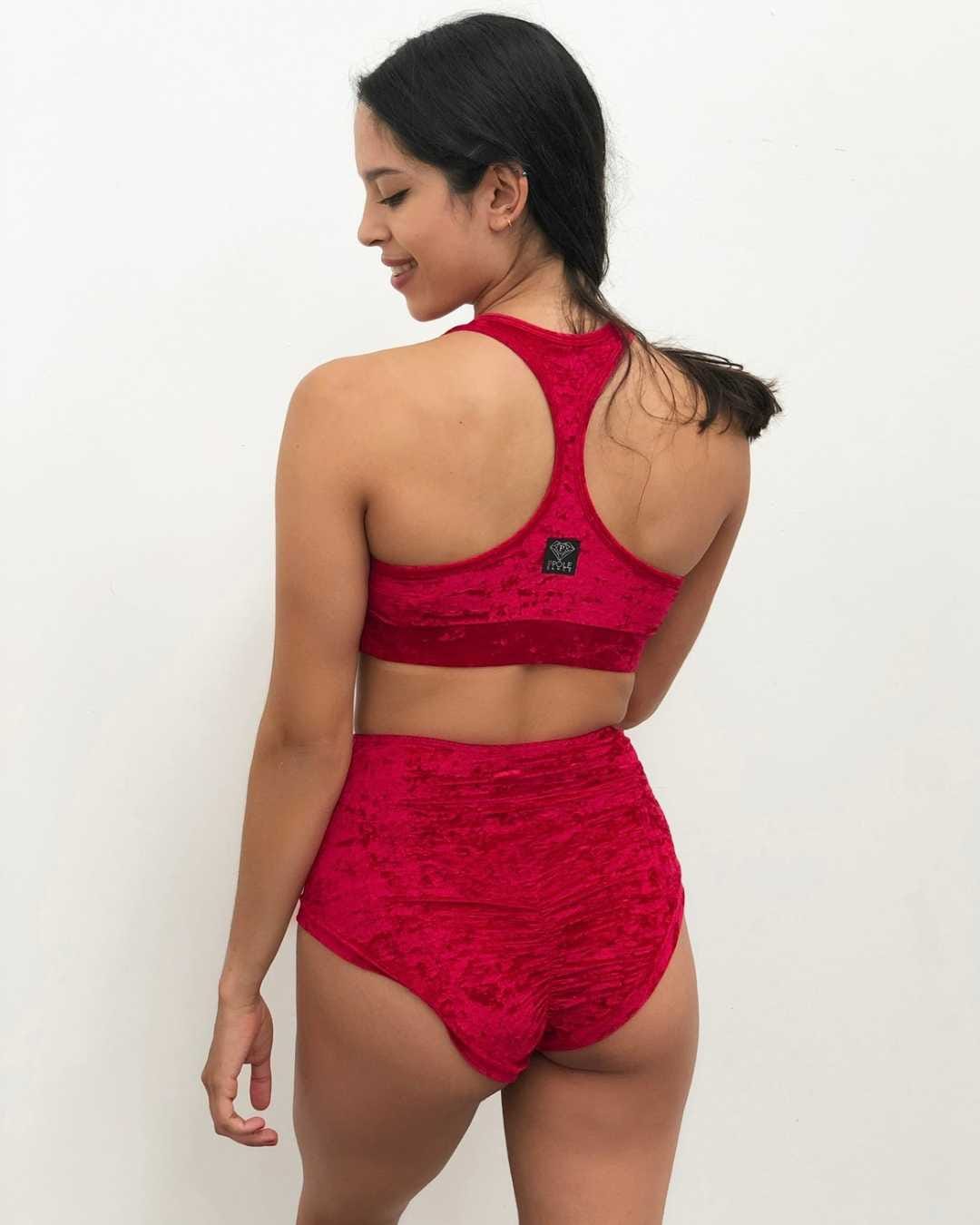 Culotte per pole dance in velluto rosso a vita alta, morbida ed elasticizzata. Mantiene i muscoli caldi, non stringe e resta stabile durante l’allenamento. Elegante e performante.
