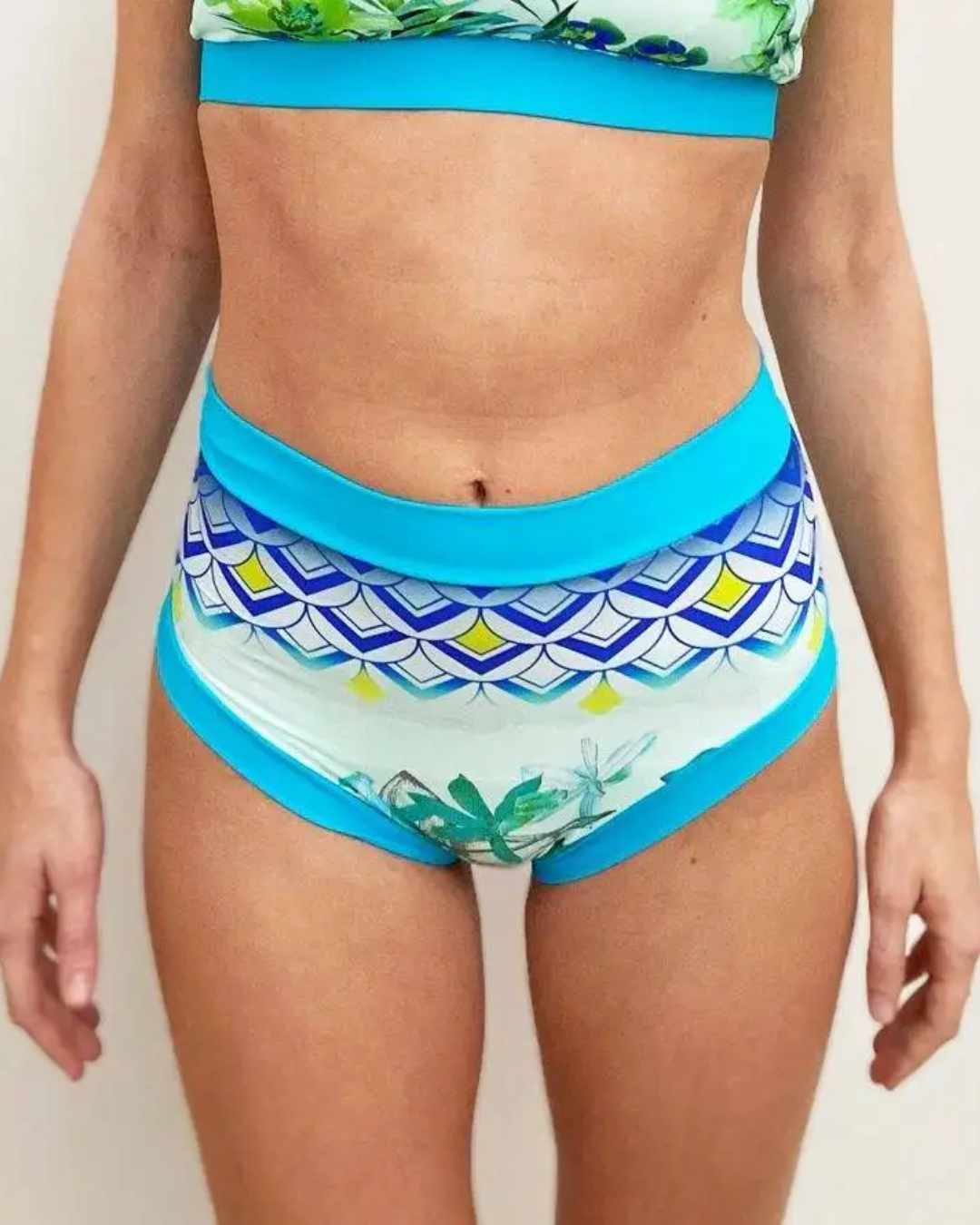 La Culotte Sirena è un modello a vita alta morbido e sostenitivo, con stampa tropicale e fascia turchese.