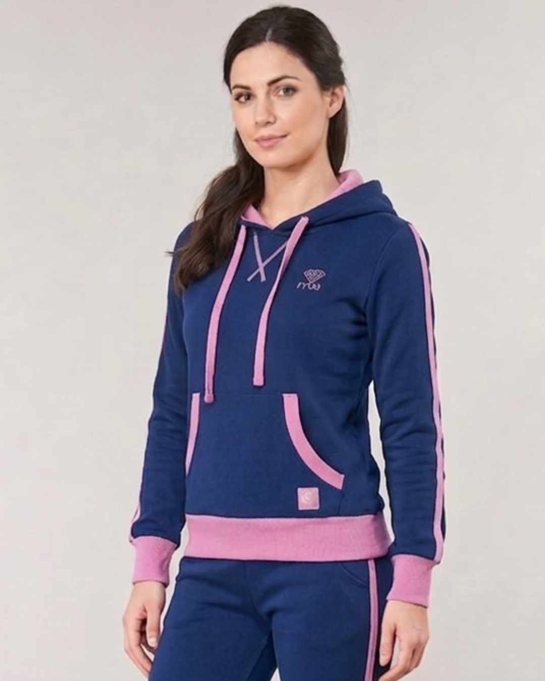 Il contrasto rosa sul cappuccio, sulla fascia in vita e sui polsini dona un tocco vivace e femminile, mentre la tasca frontale a marsupio e il cappuccio regolabile con coulisse aggiungono praticità e stile.