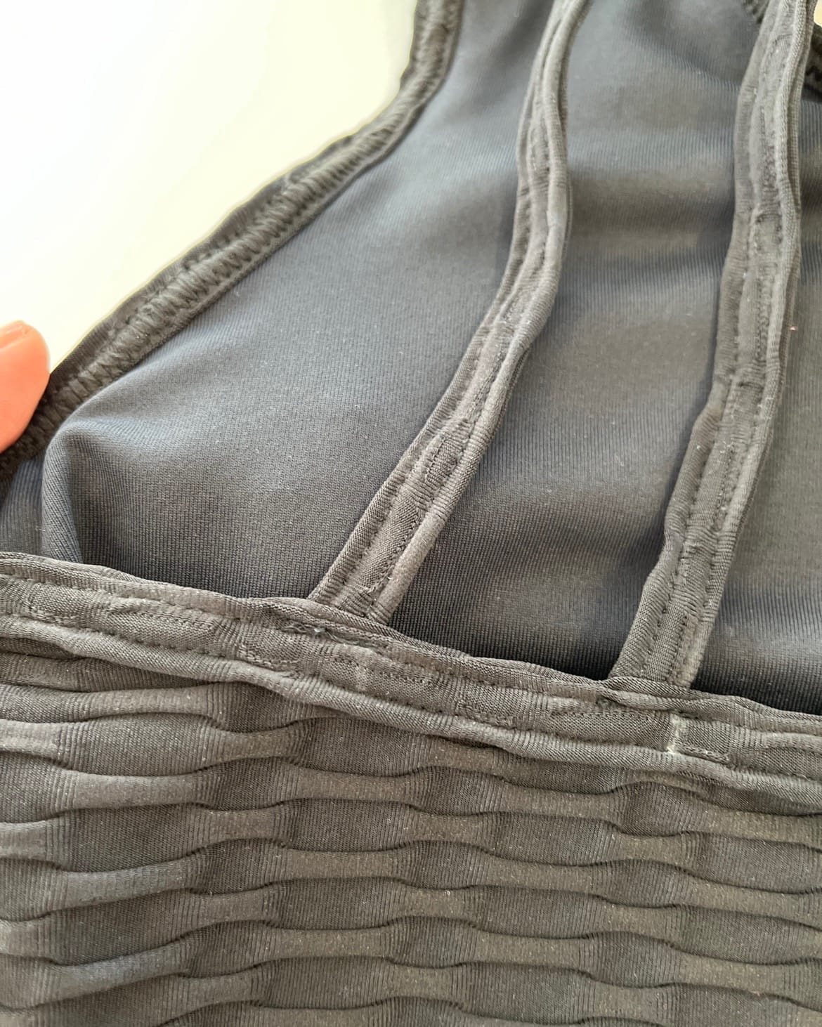 La struttura del reggiseno offre sostegno anche senza imbottitura, grazie al tessuto resistente ed elastico, garantendo comfort e libertà assoluta in ogni movimento.