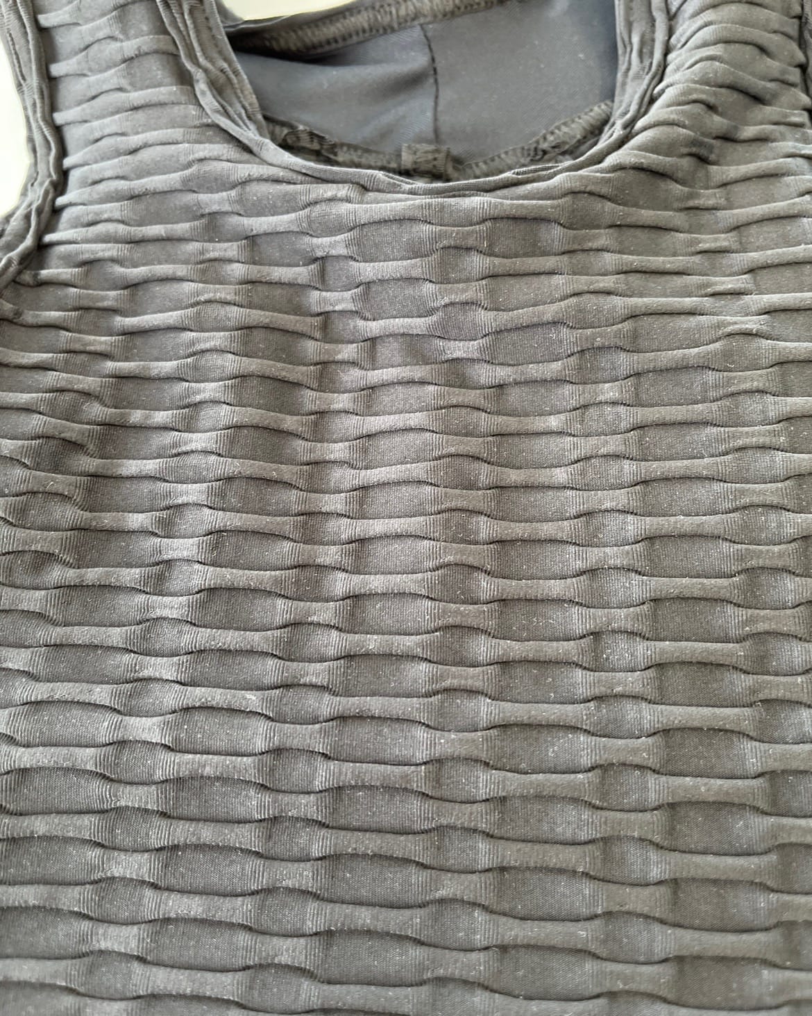 Il tessuto operato a nido d’ape dona una texture raffinata e sensuale, mentre lo scollo tondo e la spalla larga assicurano stabilità anche durante i trick più intensi. Il gioco di contrasti sulla schiena esalta le linee del corpo e rende questo capo unico nel suo genere.